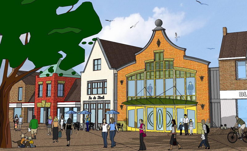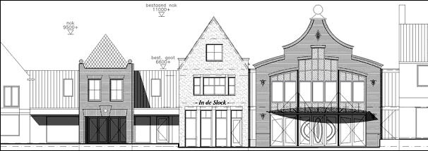 De drie onderdelen van het project (boekhandel, café, expositie- centrum) houden een eigen gevelbeeld maar deze worden wel met elkaar in harmonie gebracht.