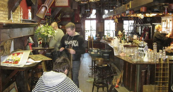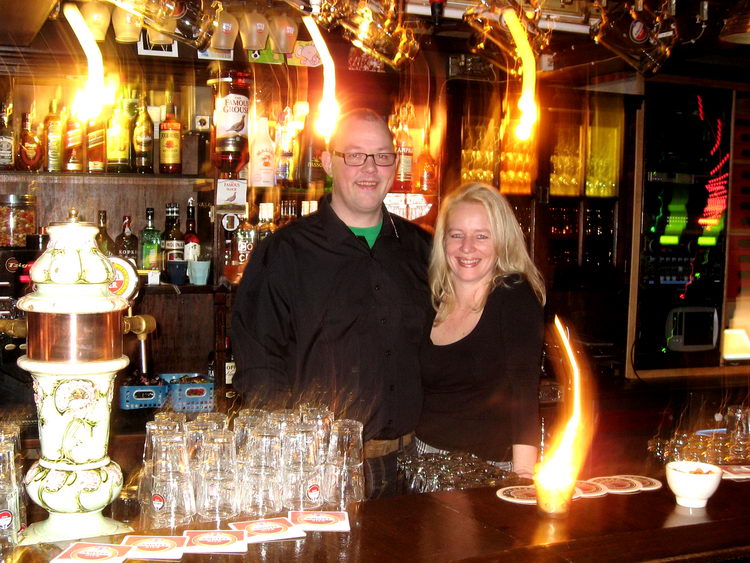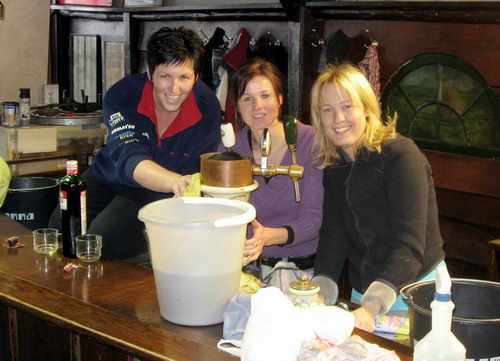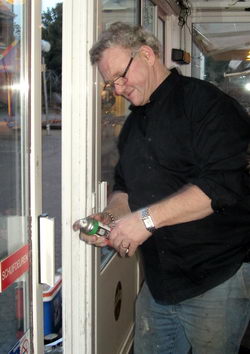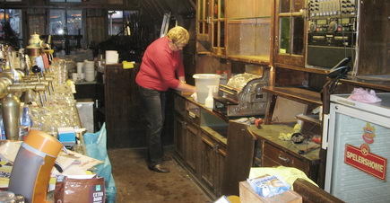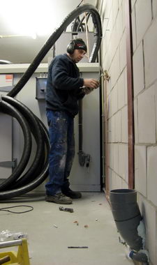 Hij heeft zojuist een doorvoer gemaakt (rechts op de voorgrond) voor de bierleiding en monteert vakkundig de waterleiding ten behoeve van de koeling.