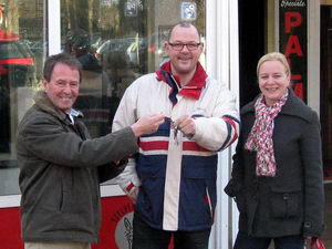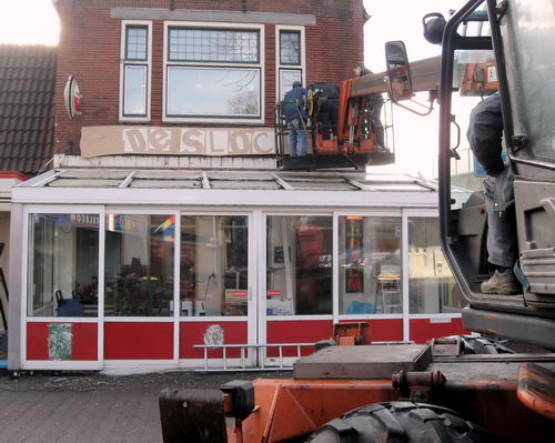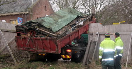 Een container vol wordt afgevoerd door de fa. Tatenhove. Stefan Hin assisteert met zijn hydrolische kraan om het nieuwe gevelbord, gemaakt door Johan Tromp, keurig op z'n plek te krijgen.