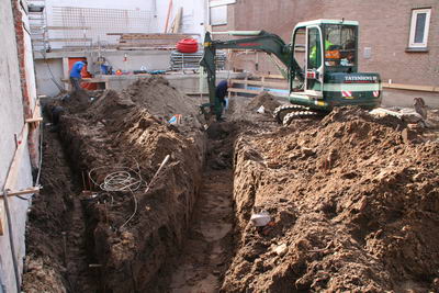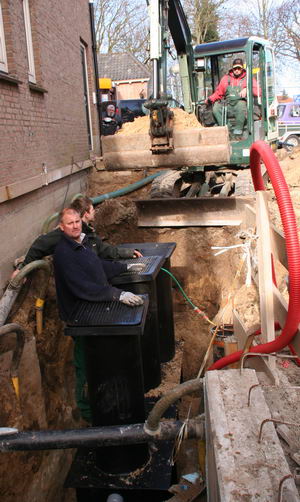 Als alle heipalen zijn aangebracht wordt een grote hoeveelheid mantelpijpen aangebracht en de vetvangput ingegraven.
