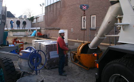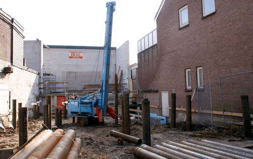 Het "plein" aan de Parkstraatkant wordt nu van heipalen voorzien. De fa. Slijkerman is op 1 maart weer gearriveerd met hun speciale machine die de stalen pijpen diep de grond inheit.