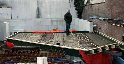 Op 28 januari is de vloer van het toekomstige podium klaar om gestort te worden. Aannemer Siep Schellinger ziet het tevreden aan (foto links).
