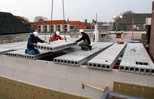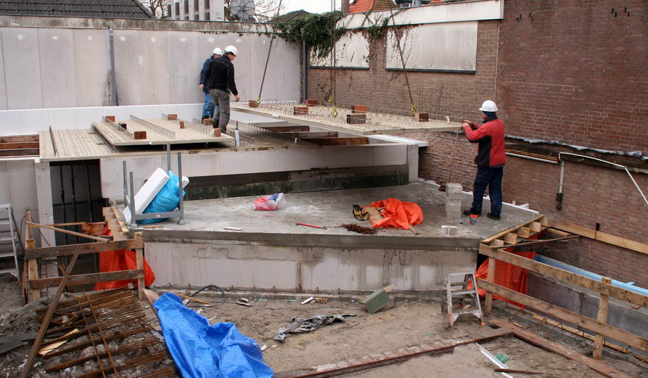Na het storten van de podiumvloer volgt op 1 februari het aanbrengen van de vloerdelen van het "split-level" zaaltje. (foto onder)