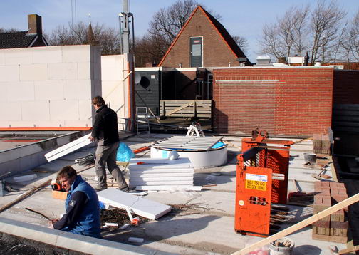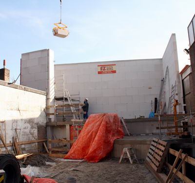 De vorst raakt over en nu gaat het hard: op 23 februari 2010 is de achtermuur op hoogte en het dak van het boekhandelzaaltje al dicht.