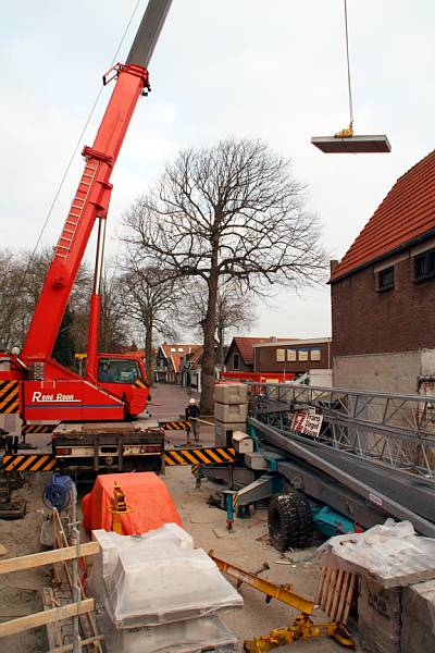 Met de telekraan van Rene Boon worden op 9 februari de dakdelen van het boekhandelzaaltje naar zijn bestemming gebracht. Daarna worden ze zorgvuldig op hun plek gelegd.