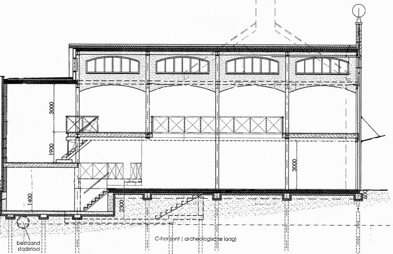 Op deze doorsnede is goed te zien hoe de verschillende nivo's zijn gesitueerd. Aanvankelijk was er onder het hele gebouw een kelder geprojecteerd. Omdat na onderzoek bleek dat deze grotendeels in een onverstoorde archeologisch waardevolle laag zou komen is daarvan afgezien. Het realiseren van de kelder zou geleid hebben tot een kostbare archeologische afgraving en flinke vertragingen.