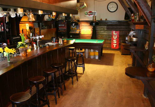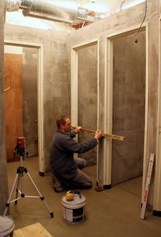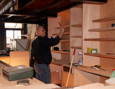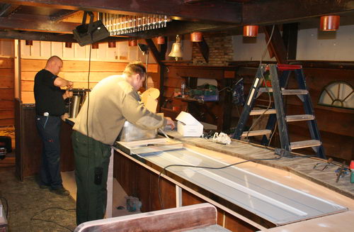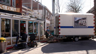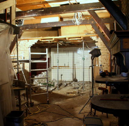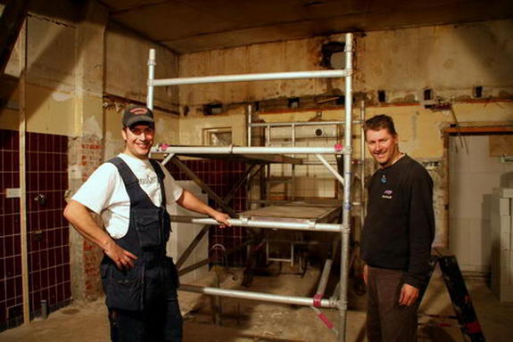 Terwijl Peter van der Voort de muren van de nieuwe toiletgroep opmetselt, is vader Huizing druk bezig met de reconstructie van de barpartij.(foto rechts)