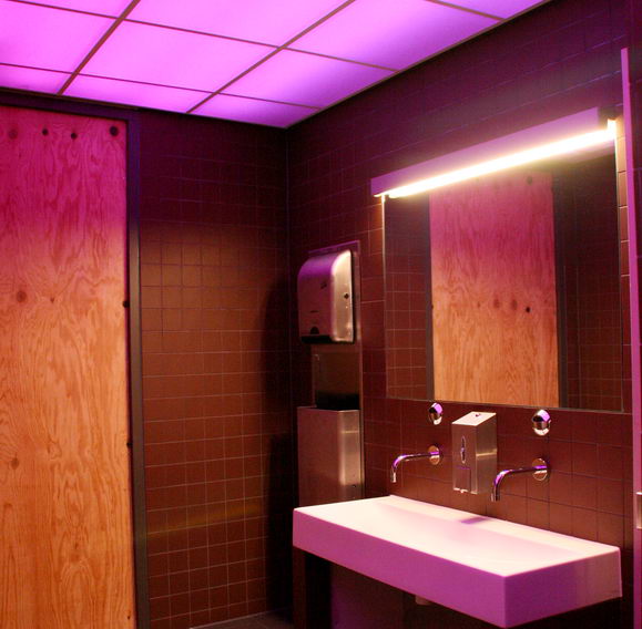 Het is nu 11 mei en de toiletgroep is (bijna) klaar en in gebruik genomen. Het plafond bestaat uit transparante platen waarachter een LED-verlichting met steeds andere kleurverrassingen.