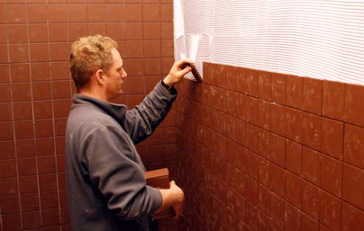 Rechts is Elmar met de bijzondere bruine wandtegeltjes bezig.